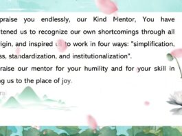 He is so careful in serving all sentient beings, and he has worked so hard to build a platform for happiness for all of us, but it is often defeated by our inadvertent annoyance. However, he did not have any complaints, and under great pressure, he still actively tried to solve the crisis, accompanied us to tide over the difficulties, and sometimes even pretended to be light-hearted, in the laughing and cursing to relieve everyone’s frustration. The care of the mentor is like the blessing of the moon love samadhi, which is tolerant and gentle, making the body and mind free from fear and attain coolness and peace.